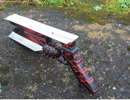This gun is 3D printed of PLA plastic (human-friendly material), assembled and sanded, hand painted with acrylic paint and varnished with a satin/glossy finish, so the paint could remain as long as possible.